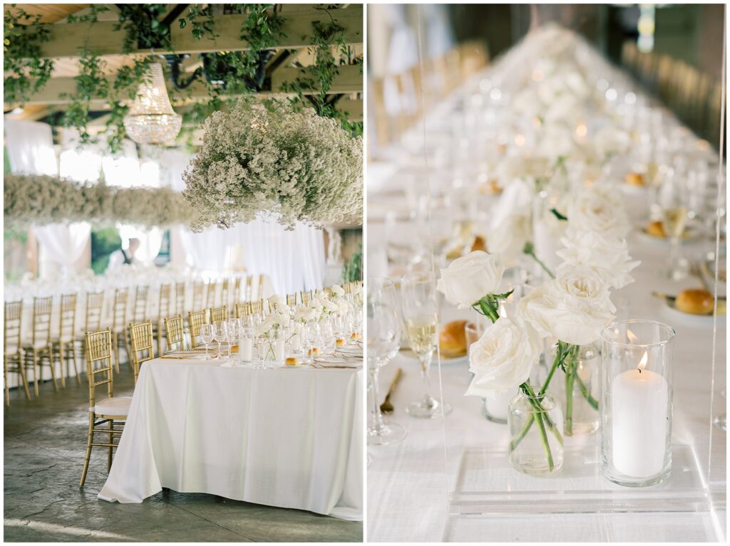 The reception space was transformed into an elevated floral dream. Lavish floral installations filled the room, with cascading white florals suspended from the ceiling to create depth, movement, and drama. Every detail—from crisp linens to candlelit tables—was intentionally chosen to reflect a refined, upscale aesthetic.
